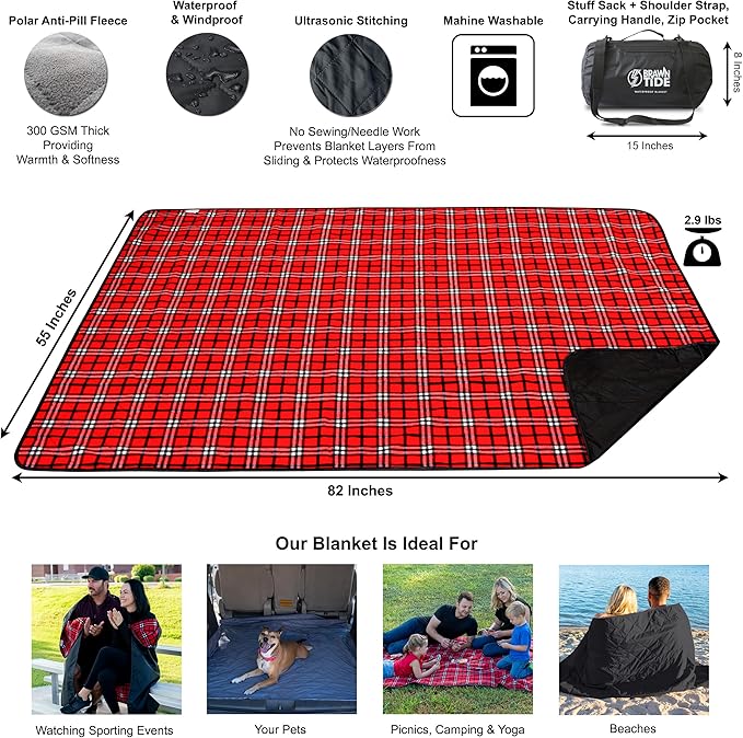 BRAWNTIDE Large Outdoor Waterproof Blanket - Quilted, Extra Thick Fleece, Warm, Windproof, Sandproof, Includes Stuff Sack, Shoulder Strap, Ideal for Beaches, Picnics, Camping, Stadiums, Dogs, Car