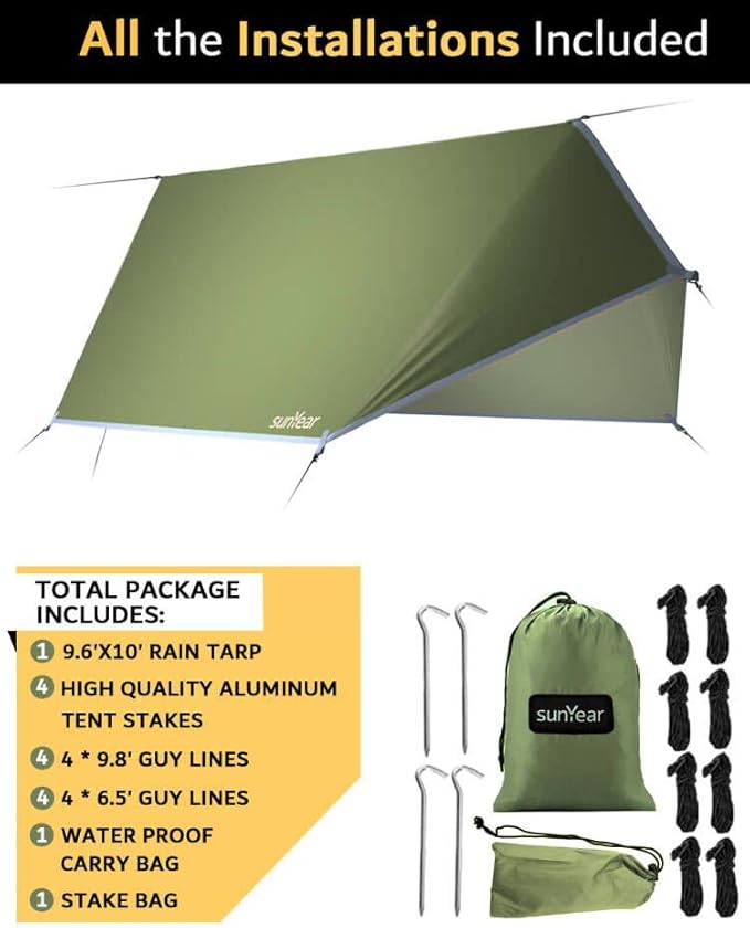 - Included Components : 4 x Aluminum Tent Stakes (lightweight and sturdy), 4x 3 Meter Guy Lines + 4x 2 Meter Guy Lines, 1 x Sunyear Rain Fly Tent Tarp (Best for most hammocks on the market), 1 x Small Accessory Stuff Sack, 1 x Rain Fly Tent Tarp Stuff Sack 4 x Aluminum Tent Stakes (lightweight and sturdy), 4x 3 Meter Guy Lines + 4x 2 Meter Guy Lines, 1 x Sunyear Rain Fly Tent Tarp (Best for most hammocks on the market… See more