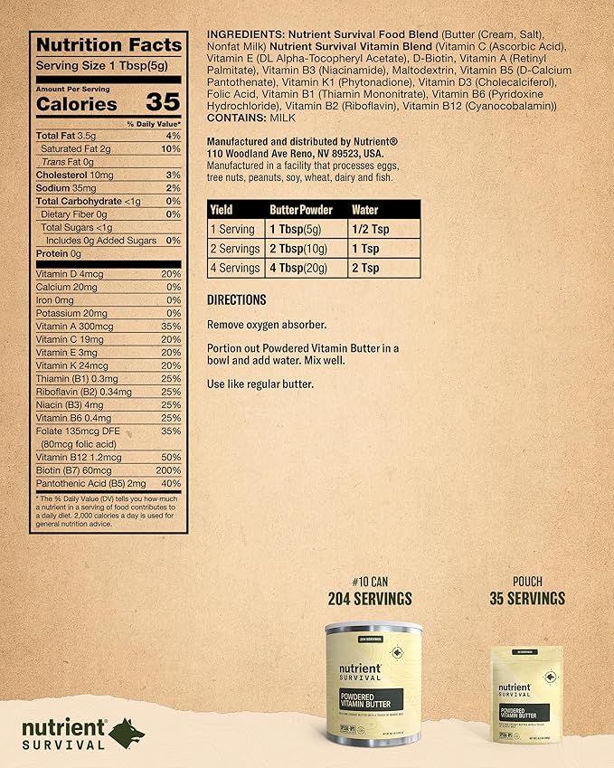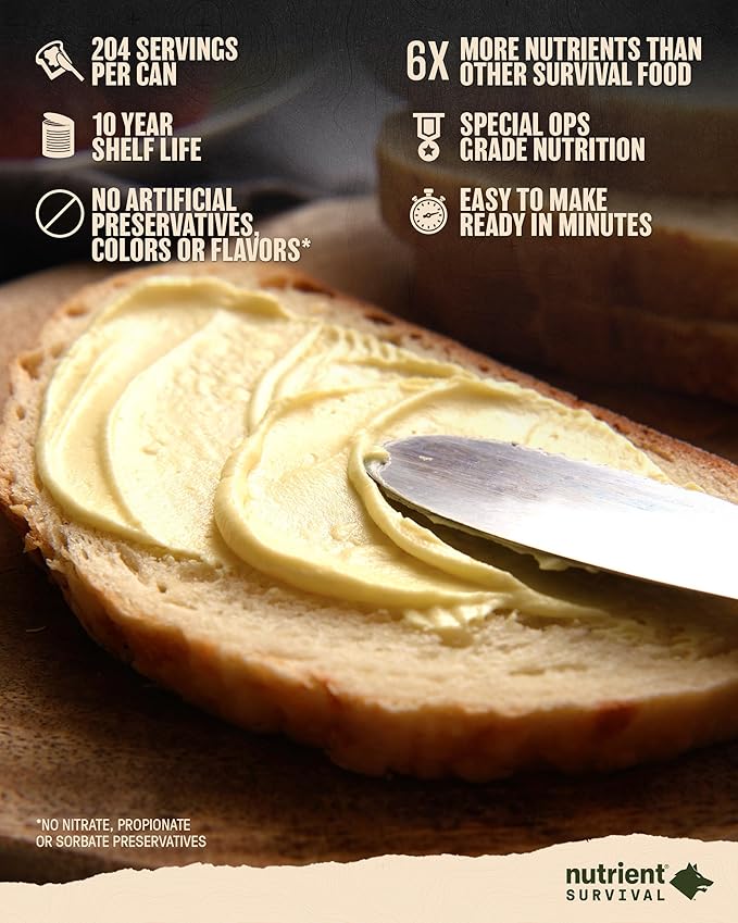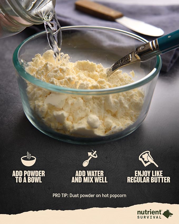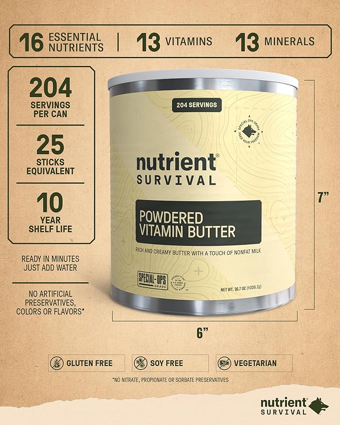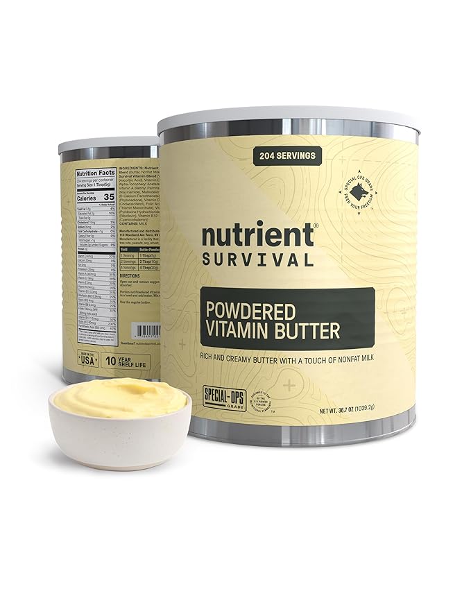 - FEED YOUR FREEDOM: Enjoy Nutrient Survival Vitamin Butter Powder with toast or use it in your favorite recipe. Just add water and stir to get your powdered butter ready to be used. Nutrient dense, equivalent to 204 tablespoons of butter per can