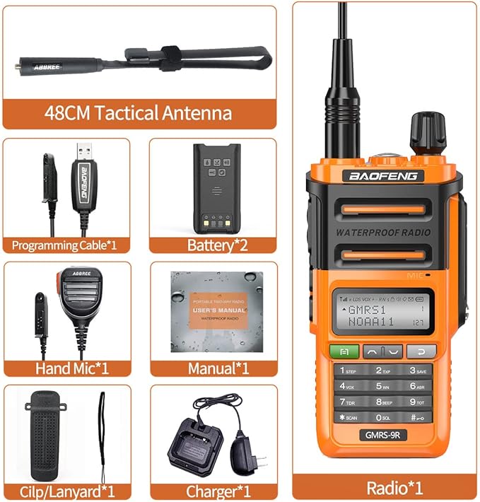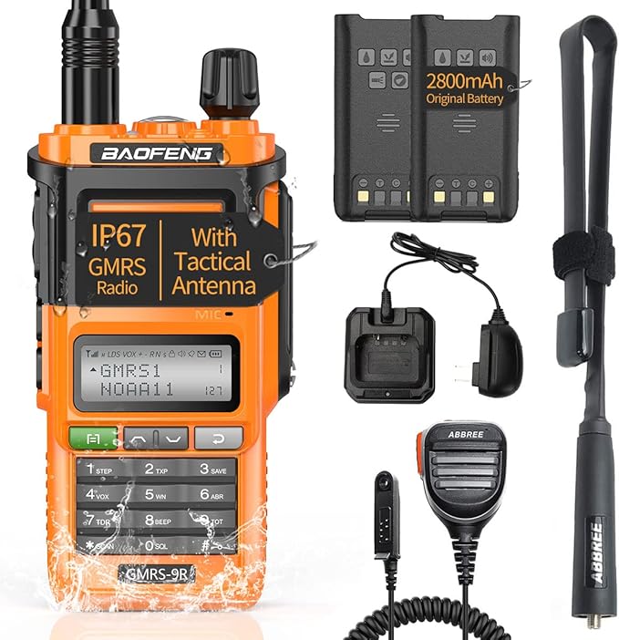 Baofeng GMRS-9R GMRS Radio Waterproof IP67 5W Rechargeable Two Way Radio for Adults,NOAA Scanning&Receiving,GMRS Repeater Capable with Extra Tactical Antenna,2800mAh Battery,Speaker Mic Orange