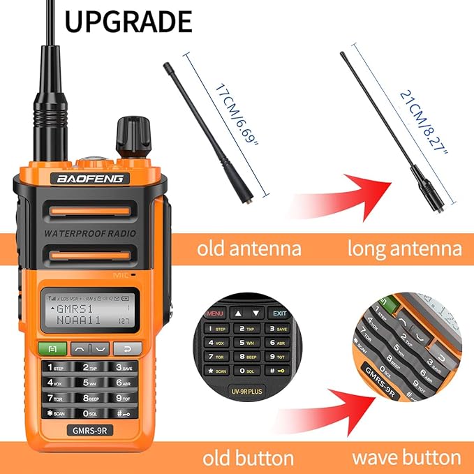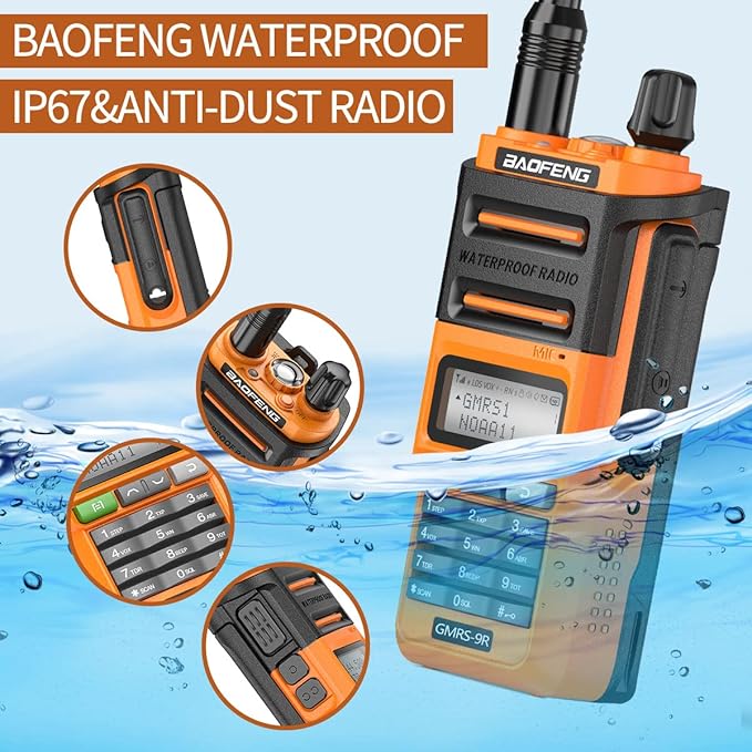 - ★【IP67 Waterproof Features】9R Plus upgrade version,The GMRS Radio with better waterproof and dustproof capabilities(Not diving),can be submerged in 5 feet / 1.5 meters of water for 30 minutes, and can meet the needs of outdoor sports, camping, mountaineering etc in the bad weather, which ensures the reliability of the walkie-talkie in wet environments.