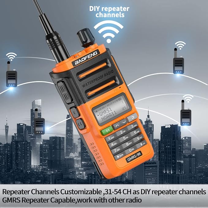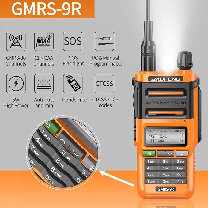 - ★【Professional GMRS Radio】GMRS-9R has 30 GMRS channels + 11 NOAA weather channels,You can easily add new channels and change settings on the go by the PC and keypad menu programs, 155 Privacy Codes (50 CTCSS codes/ 104 DCS codes) ,Reduce interference.FCC ID: 2AJGM-P52UV.Note: In order to meet the FCC requirements, Baofeng will upgrade the GMRS-9R series of walkie-talkies, and the radio not have FM radio function.