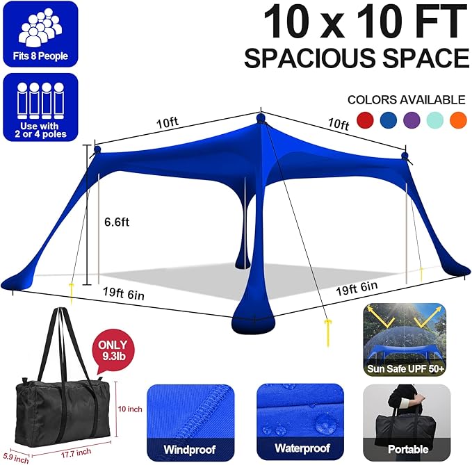 - UV Protection and Waterproof:Beach tent pop up sun shelter 10x10ft is made of high stretch Lycra fabric which is waterproof, windproof, sun protection, lightweight so that you will never worry about any stretches and tears. Our beach shade canopy offering UPF 50+ sun coverage to keep you and your family from the harmful UV rays and reduce sun burn or glare making it ideal for kids or adults laying out. This large sun tents for long-term outdoor use