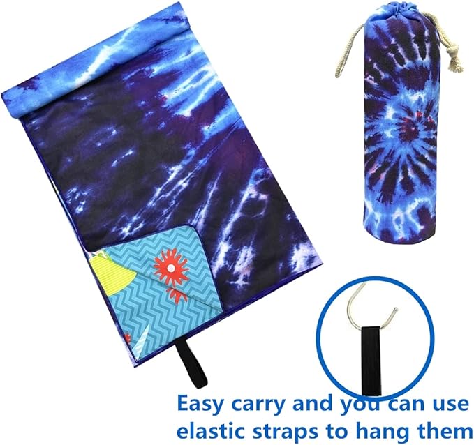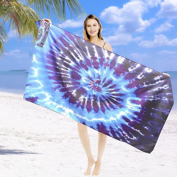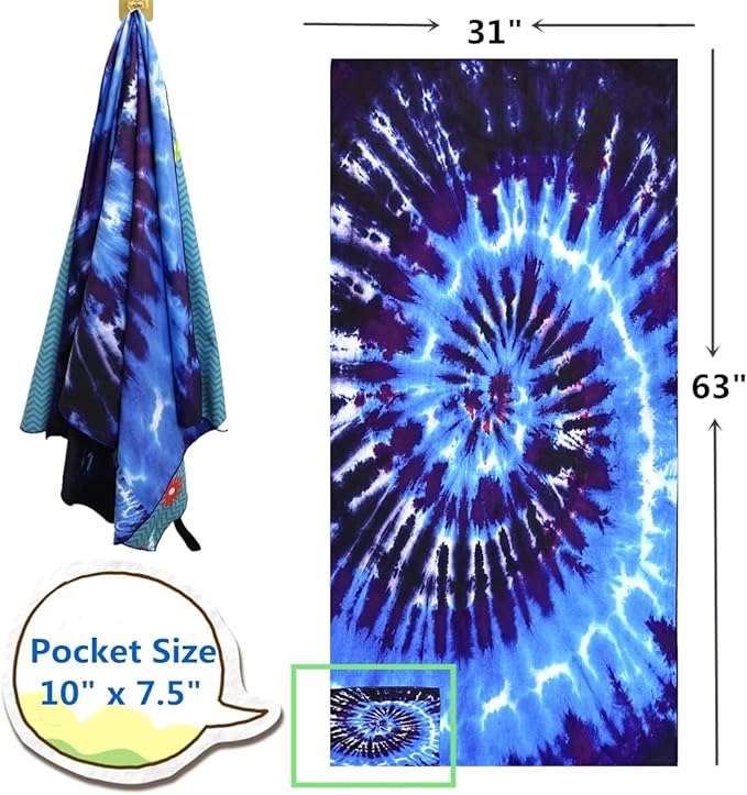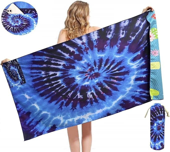 Beach Towel Microfiber Beach Towel with Pocket Sand Free Beach Blanket Super Lightweight Thin Towels for Swimming Pool, Camping, Picnic, Yoga Gym Sports, Blue Die dye Beach Towels (tie dye blue)