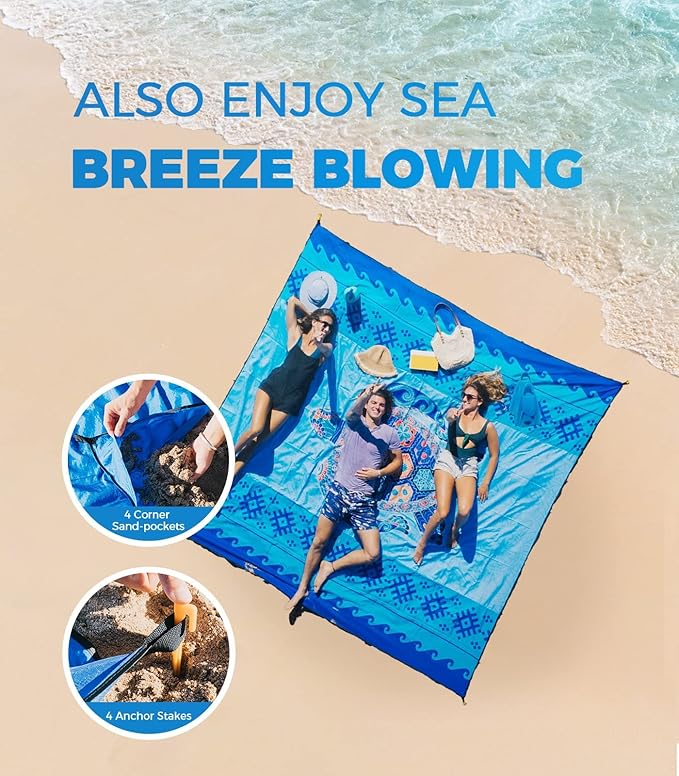 - Sand-Proof Material: This new material makes sand removal a breeze. Fill the four sand pockets with sand or rocks, or using stake loops to keep the blanket in place on firmer ground. No more concerns about crumpling or tearing.