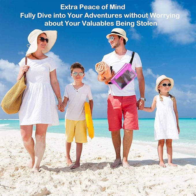 - Beach Accessories for Vacation: Waterproof Protection and Confident Impermeable! Triple zip lock protection up to 32 feet (10 meters) underwater. No worries of your valuables getting wet. Keep your phone and wallet perfectly dry and safe from a splash, a spill, or total immersion whether you're snorkeling, swimming, sailing, paddle boarding, tubing, kayaking, river rafting, water slides or water activities and the like!