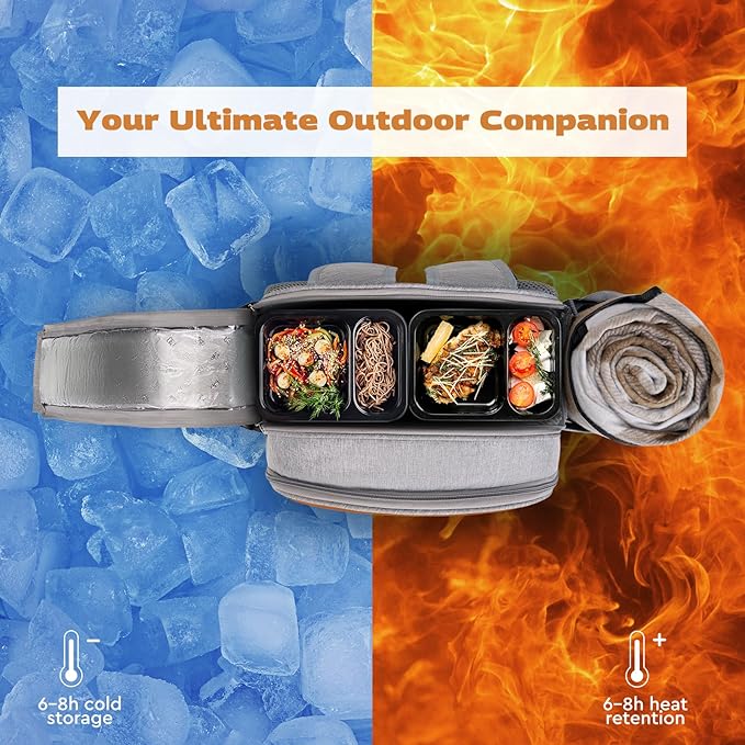 - LARGE CAPACITY & WELL EQUIPPED: Size: 12(L)x7.5(W)x15(H) inches, 5.2 lb; The 22L high-capacity picnic backpack big enough to accommodate the ingredients needed for a picnic. Includes a full set of camping accessories: backpack cooler, picnic blanket, wine bag, cutlery and cutting board, etc. The camping backpack bag is made of 100% polyester fabric and 5mm PE foam and PU layer, which can keep the hot/cold/fresh for hours.