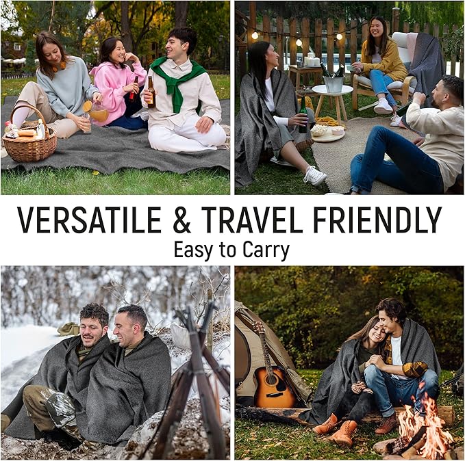 - 🛖【MULTI-USE WOOL BLANKET - HOME TO CAMPSITE】 This versatile Wool Blanket serves multiple purposes: Car Blanket, Picnic Blanket, fire pit companion, indoor fireplace comfort, and Camping Blanket. Perfect for cozy nights at home or outdoor adventures, it offers comfort and warmth while meeting military-grade durability standards.