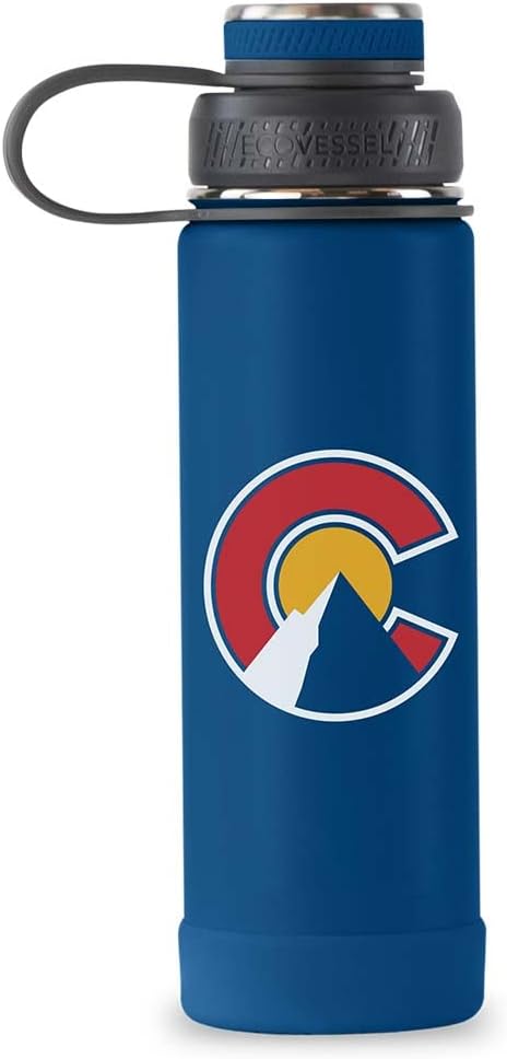 EcoVessel Stainless Steel Water Bottle with Insulated Dual Lid, Insulated Water Bottle with Strainer and Silicone Bottle Bumper, Coffee Mug – 20oz (Navy-Colorado)