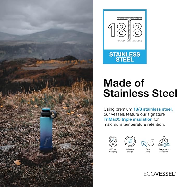 - OUR WARRANTY: EcoVessel reusable water bottle is crafted with long-term durability in mind; confidently backed by a 100-YEAR warranty. Invest in portable drinkware designed to withstand a century.
