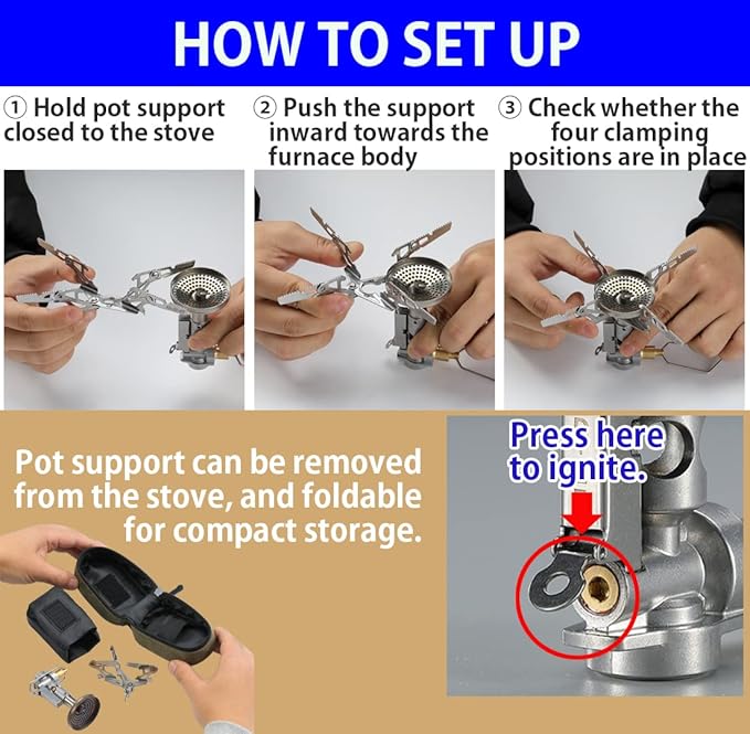 - This CAMPINGMOON's backpacking pressure regulated gas stove with Igniter XD-2F is lightweight & foldable & compact. You can fold this backpacking stove's pot support and remove it from the stove body, and put it into attached storage bag. It's a very convenient backpacking stove to carry with.