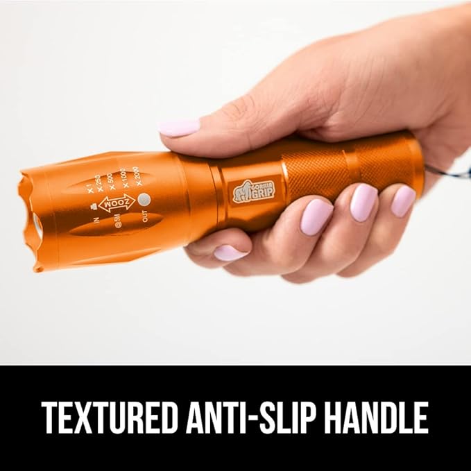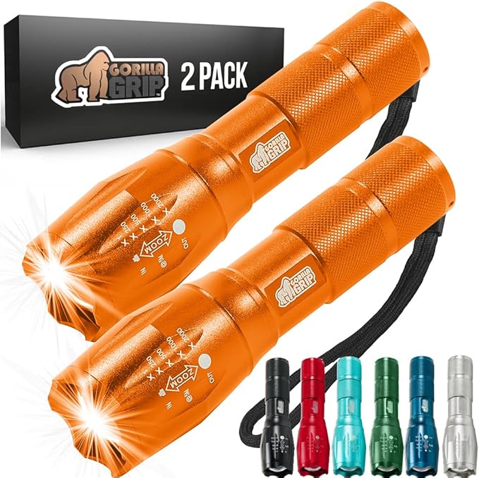 Gorilla Grip Powerful LED 750 FT Water Resistant 5 Adjustable Mode Tactical Flashlight, High Lumens Ultra Bright Battery Zoom Flashlights, Small Camping Car Mini Flash Light Accessories, 2 Pack Orange