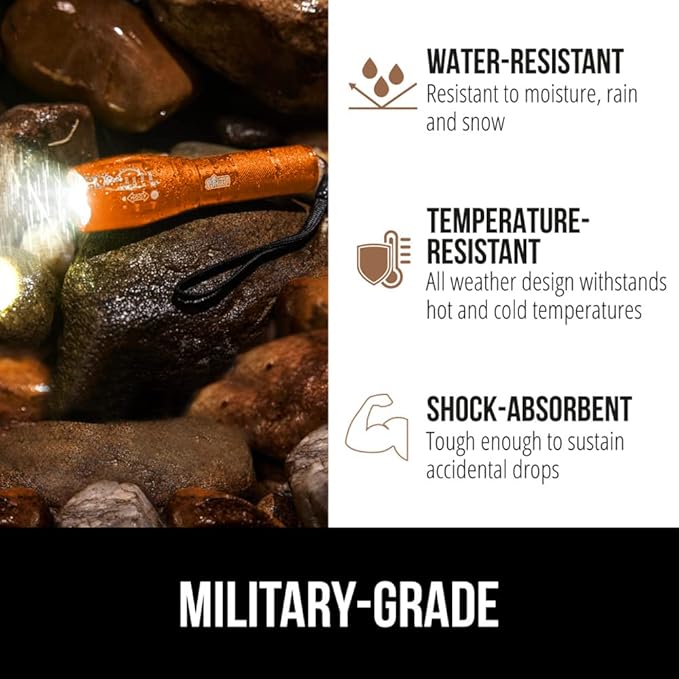 - EXTREMELY DURABLE: all weather, ultra durable aluminum alloy flashlight is shock resistant, water resistant, and temperature resistant; the perfect option for any outdoor activity; take it with you hiking, camping, biking and more; flashlight is tough enough to sustain accidental drops up to 3.3 feet as well as water submersions; includes a run time of up to 9.5 hours