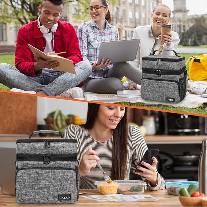 opux Insulated Lunch Bag for Men Women, Large Dual Compartment Cooler Bag, Soft Two Deck Lunch Box for Work School Picnic, Leakproof Lunch Tote with Shoulder Strap for Kid Adult (Gray, Double Deck)