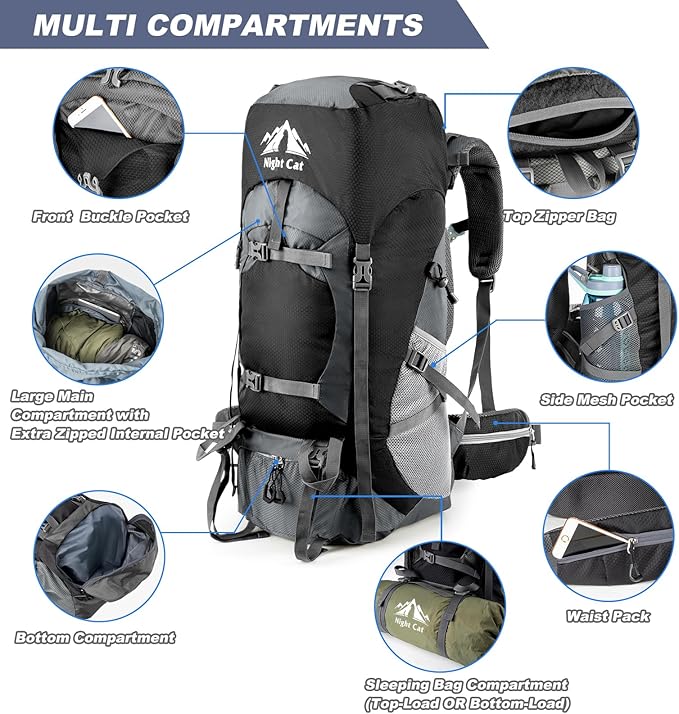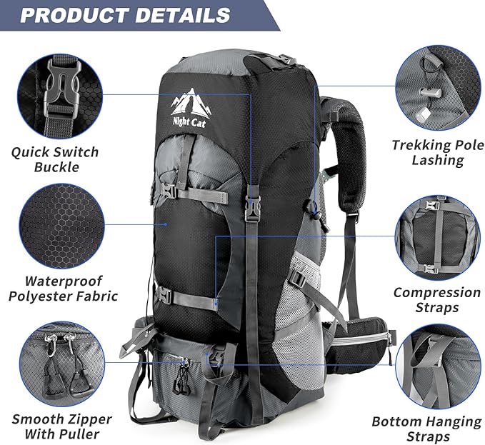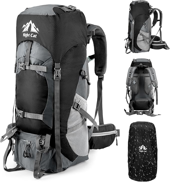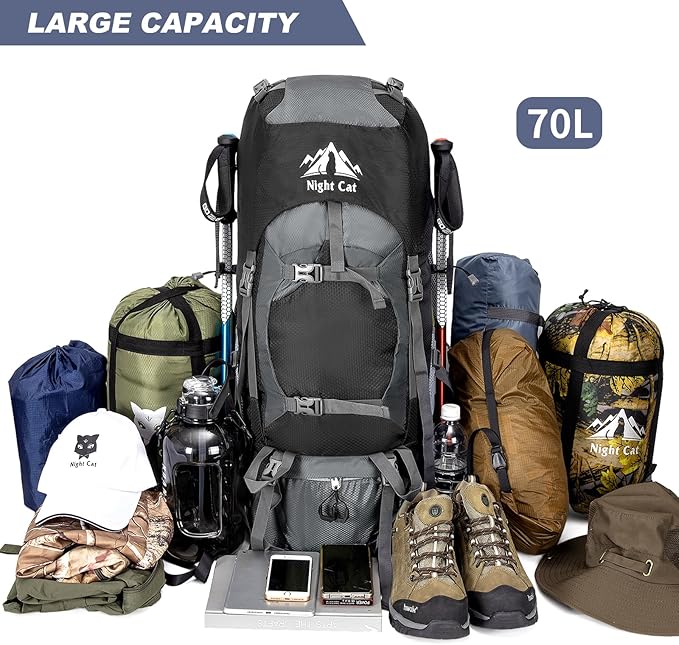 Night Cat Hiking Backpacks 70L Camping Backpacking Packs for Men Women Lightweight Outdoor for Mountaineering Traveling, No Internal Frame