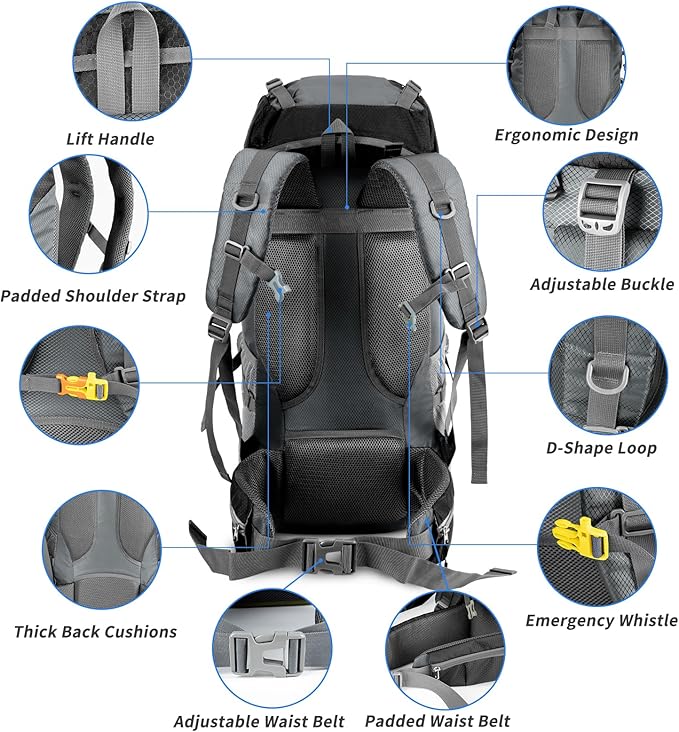 - 【70L Large Capacity & Multi Compartment】This lightweight hiking backpack only weights 1kg. The Size of backpack is 33X27X73cm and the loading capacity up to 70L.With multiple storage compartments and the large main compartment with extra zipped internal pocket,makes your items organized well.Good daypack for a short outdoor trips