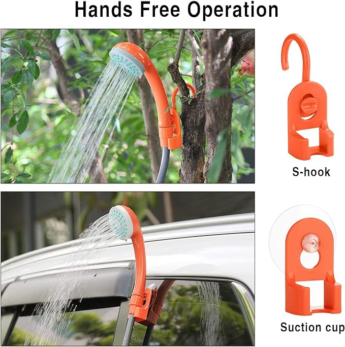 - 【Easy to Operate】 Attach pump and shower head to the hose. Immerse the pump completely in the water, then use the hook, bracket or suction cup provided to secure the shower before turning on the power. Finally the water is pumped up from bucket and you get a nice flowing shower.Scientific and beautiful design, easy disassembly, charging and cleaning.