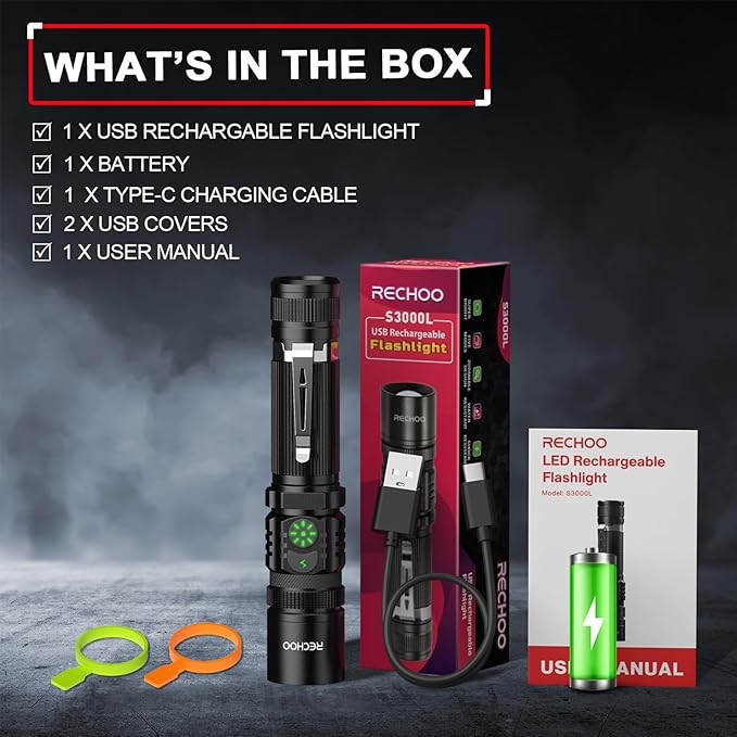- Great Value Packaged: what you will get: 1* High Lumens Rechargeable LED Flashlight 1* Rechargeable Battery, 1* Type-C charging cable, 2* Extra USB Cover, 1* User Manual; Will be a nice gift for your father, mother, and friend; Note: Before using the flashlight for the first time, please remove the insulating sheet from the battery to ensure that the flashlight can be charged properly;