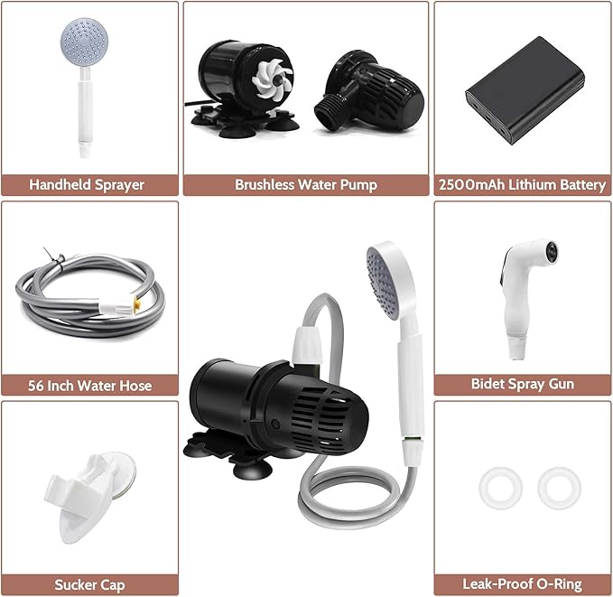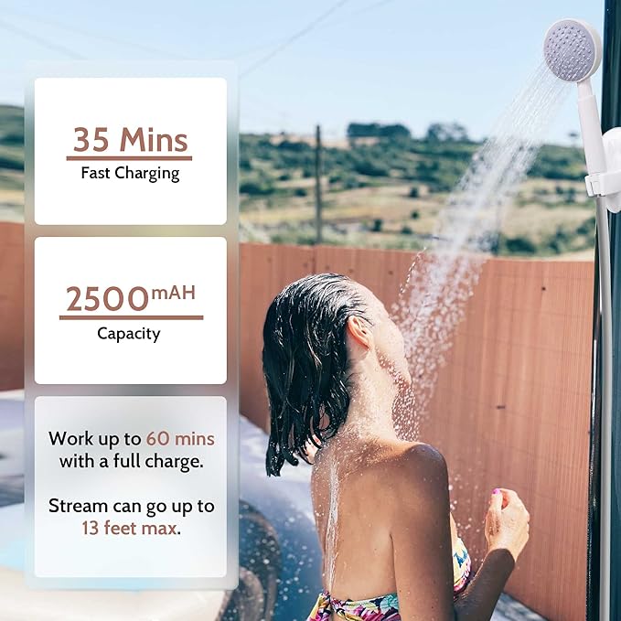 - 【Upgrade Power Supply】2500 mAh Rechargeable Battery Provides Continuous Power Sources to the Pump, it can Keep Working for 60 Mins and at Least 3 Showers with One Time Charging.