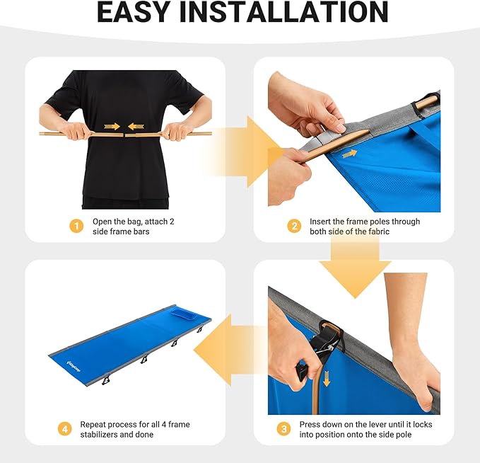 - ✔EASY to SET UP and LIGHTWEIGHT PORTABLE DESIGN: No assembly required. The sleeping cot for adults can be easily installed or folded up into an included storage bag within 10 seconds. Pack size 14"×5.1"×5.1". Weight 4.4 pounds.