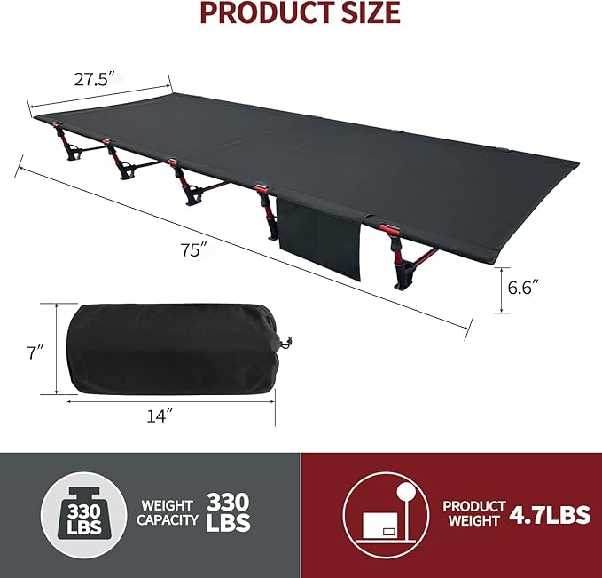 - Cot bed size 75" × 27.5" × 6.6", folds down to 7" × 14", can be easily fit into your backpack. Cot weighs 4.7lbs and can support up to 330 pounds. With 10 points of contact with the ground to evenly distribute weight, the cot is very stable.
