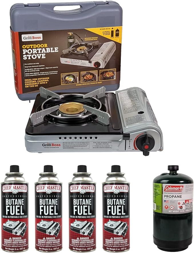 - PERFECT FOR CAMPING - The Grill Boss Butane Camp Stove is your ideal companion for camping, hiking, backpacking, and other outdoor activities. Its compact design allows it to fit snugly into a hard shell plastic case, making transportation a breeze. The Grill Boss Dual Fuel Camp Stove features a compact and portable design, making it easy to transport to your favorite camping spots. Its thoughtful design allows it to fit snugly into a hard shell plastic case, ensuring hassle-free transportation.