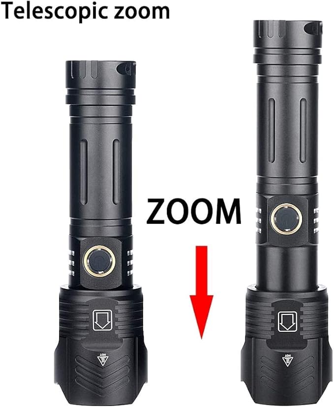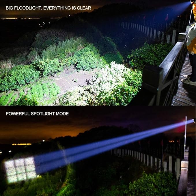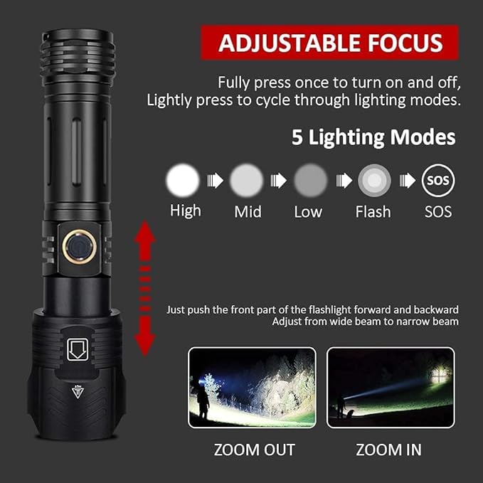 - 【Super Bright】This flashlight 1200000-lumen (max) LED combines with PDO technology for extreme lighting performance. Features High / Medium / Low / Strobe / SOS modes function.Easy to change modes by pressing the switch button gently.Stretch the head of the flashlight to change the focal length.Astigmatism is suitable for large-area lighting.Spotlight flashlight is suitable for long-distance lighting.