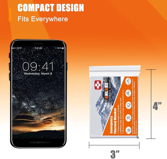 - ★LIGHTWEIGHT & EASY TO CARRY★--Individual package size: 6" x 4", weighs about 2 ounces . Each emergency blanket is easy to carry with you wherever you go. you can put it in your backpack and pocket easily without stress. Our thermal blankets are a must-have for camping, trail running, marathons, 48hr/72hr/30 day go bags, tactical gear preppers, earthquake survival kits, and travel first aid kits.