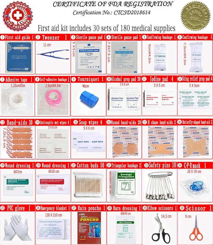 - ✅: Our first aid kit includes 30 sets of 180 pieces of medical supplies. With 8'' x 6'' x 4'' overall dimension the kit weights only 1 lb. Water resistant nylon case and it protect your medical supplies. It's light, and is all organized nicely. The kit also offer extra space to add your own stuff.