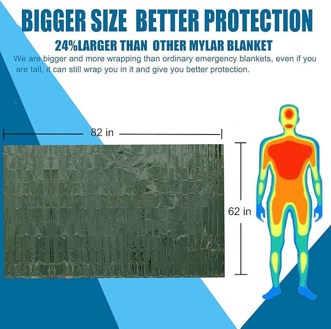 - ★UPGRADED DESIGN★--Our Survival Blanket size: 82"x62'', Thickness: 15 μm, It is thicker, and stronger than most emergency blankets,Can cover the body better and conserve body heat