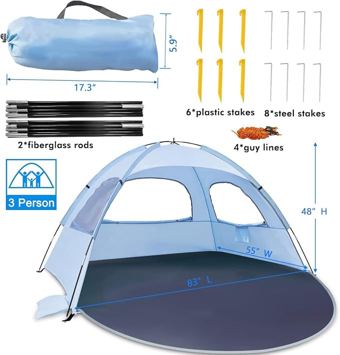 - Stability & Windproof: Good rods are the key to keeping a tent stable and windproof, so we use the 8mm fiberglass rods. And Our beach tent is also equipped with 3 sandbags, 8 steel stakes, 6 sand stakes and guy lines. The combination of socket and stake can make the tent grip more firmly and resist strong wind more effectively.