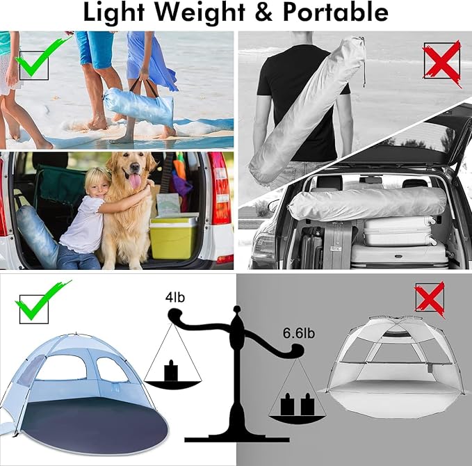 - Light Weight & Portable: Our beach tent is light weight, portable and easy to fold down with a compact carrying bag. Small size makes it easier to travel and store. It's convenient to carry anywhere you want. Just go on a beach trip with your family! (Tips: It is recommended to enlist a helping hand from another person for an easier assembly and setup)