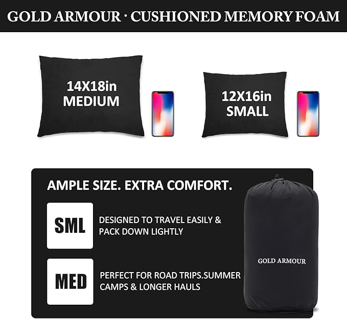 - COMFORTABLE: Our Gold Armour pillow is stuff with cushioned memory foam and wrapped in a soft, micro-suede cover. This travel pillow gives you a well deserved supportive rest that your head and neck will thank you for! Our compressible pillow can also be used as a seat cushion too