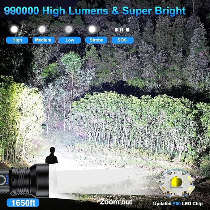 - 【990,000 High Lumens Flashlights】The super bright flashlight build in 5000 ɱAh rechargeable ΒATTERIES and adopts the latest XHP50LED bulb, the light is uniform, it is not easy to short-circuit after long-term work. The output power up to 990,000 lumens and the service life is as high as 10000 hours. The rechargeable flashlight has a range of up to 1650 feet, making it easy to light up your back garden.