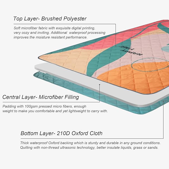 - THREE LAYERS: Made of multi-layers materials with ultra-sonic quilting technology. Soft brushed fabric on the top, padding with pressed microfibers, and sturdy 210D Oxford cloth as backing. Both the top and bottom are processed with waterproof finish,non-thread sewing further improves the moisture performance, and better insulates grass or sands. [Be Aware: No resistant to hot water!]
