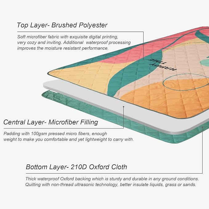 - Three Layers: Made of multi layers materials with ultra sonic quilting technology. Soft brushed fabric on the top, padding with pressed microfibers, and sturdy 210D oxford cloth as backing. Both the top and bottom are processed with waterproof finish,non thread sewing further improves the moisture performance, and better insulates grass or sands