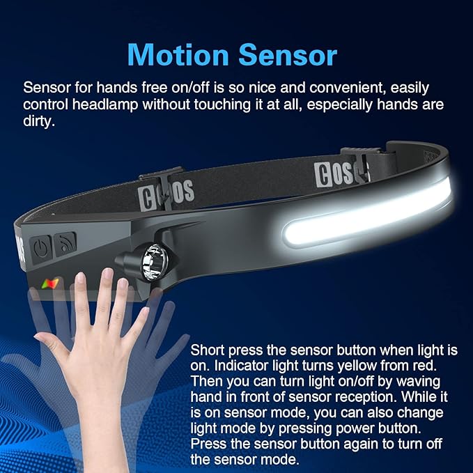 - Motion Detection Technology, Hand-Free Light: Save tons of extra battery. Our COSOOS wide angle headlamp has built-in lithium battery and please charge it by included usb c charging cable before use. Choose 1 of brightness settings, short press sensor button and set it as motion detection (Indicator light turns yellow from red.) Then you can turn light on/off by waving hand in front of sensor reception