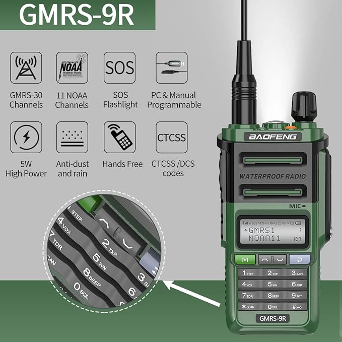 - Professional GMRS Radio:GMRS-9R has 30 GMRS channels + 11 NOAA weather channels,You can easily add new channels and change settings on the go by the PC and keypad menu programs, 155 Privacy Codes (50 CTCSS codes/ 104 DCS codes) ,Reduce interference. FFC ID: 2AJGM-P52UV.