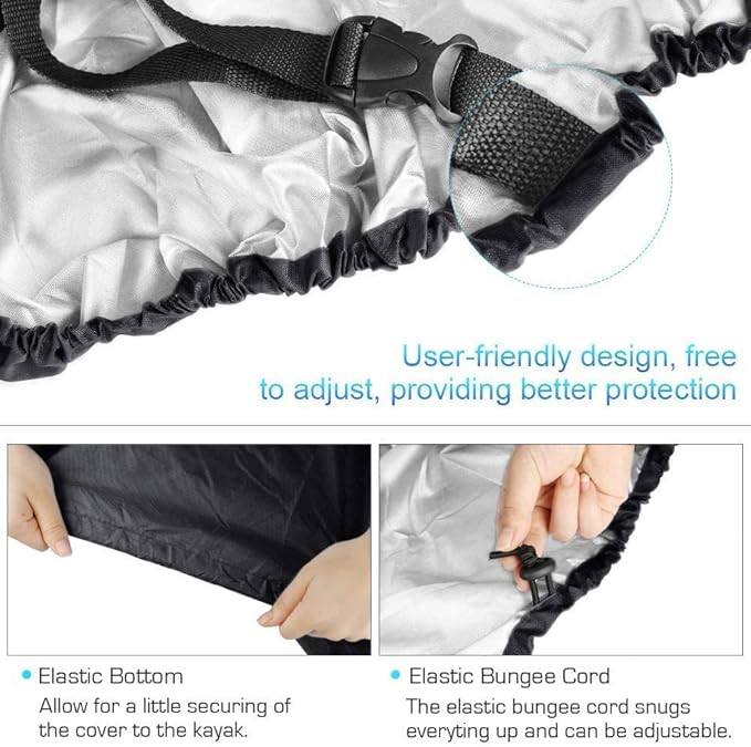 - ★THICKENED AND HIGHLY FADE-RESISTANT MATERIAL -- The UPGRADED kayak cover adopts 300D Thicken and Durable oxford Taffeta material with silky hand felt and glossy surface with silver paint material back inside, is more fadeless, UV resistant, waterproof and ripstop