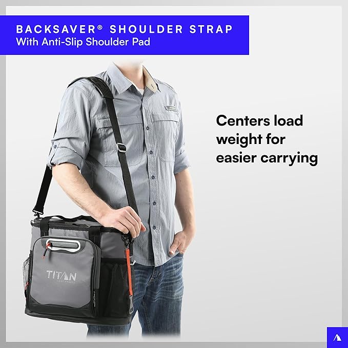 - TITAN DEEP FREEZE TOTE COOLER: Insulated main compartment with easy access hatch for quick access to food and beverages; Includes two mesh side pockets and exterior zippered pocket for extra storage; Keeps ice up to two days and holds up to 24 cans