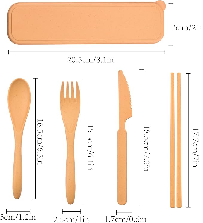 - 4 utensil sets for lunch: Orange, blue, green and yellow camping utensils, each set includes 1 spoon, 1 fork, 1 knife, 1 pair of chopsticks and 1 carrying case.