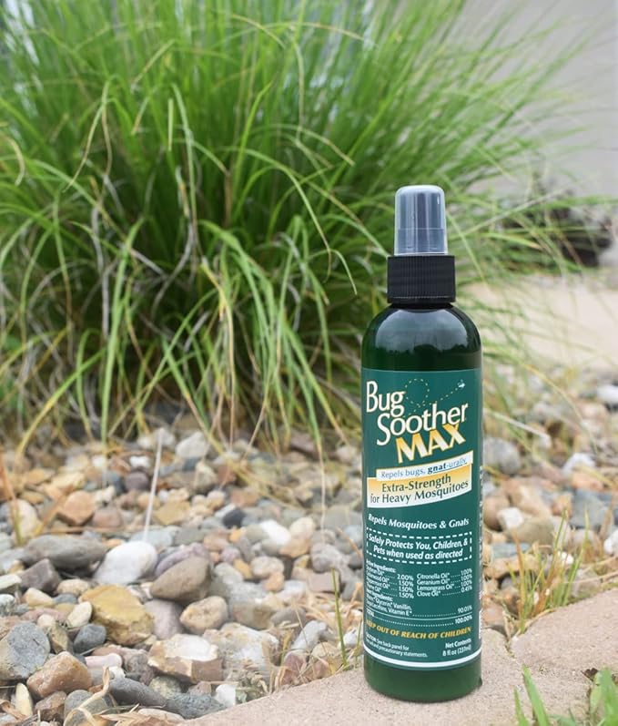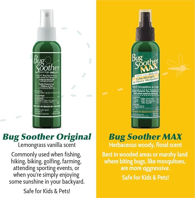 - PREMIUM INGREDIENTS: Bug Soother Max is a natural insect repellent with an herbaceous aroma utilizing woody & floral essential oils. It's non-toxic ingredients include soybean oil, essential oils, purified water, glycerin, vanillin, soya lecithin and vitamin E - a formula that works great but bugs hate!