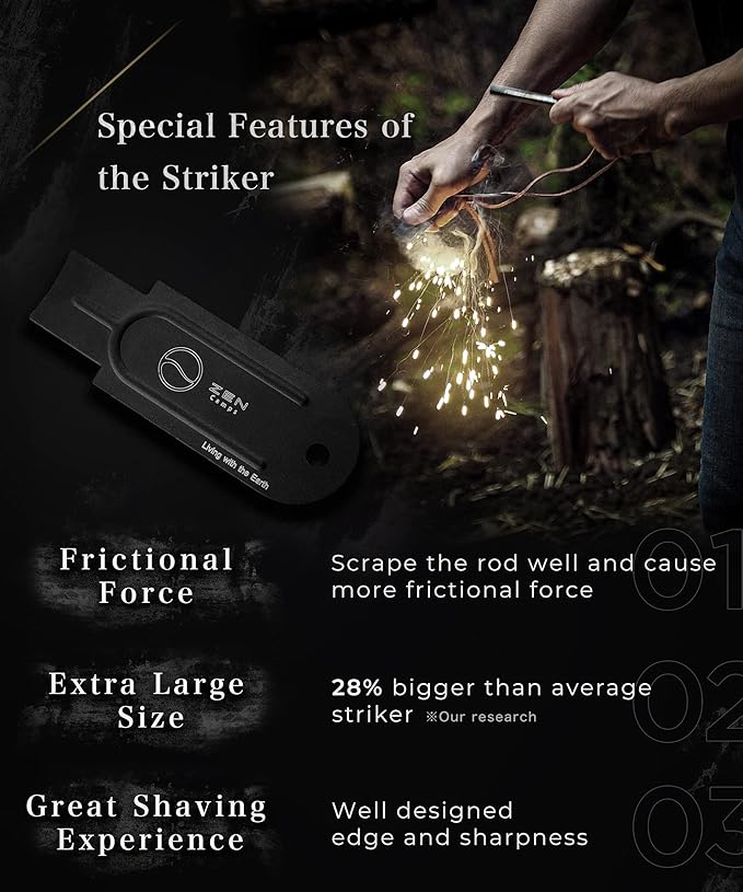- This is the fire starter that ZEN Camps took more than a year to develop. A ferrocerium rod with perfect firmness and shape. A striker that is well made for the maximization of sparks. These 2 components have been implemented into our product to achieve a new level of ignition power. Totally recommended for those who had difficulties using other fire starters and/or beginners. This is a Must-Have item for bush craft!