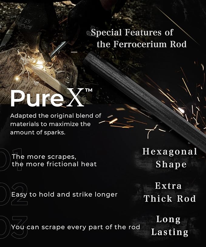 - 【Special Features of the Ferrocerium Rod】We prepared this extra thick rod made out of ferrocerium, which is superior to magnesium for ignition. You can create hot sparks that are about 3,000℃. We used Pure-X, our original blend of materials, which makes our ferro rod the perfect firmness to provide many sparks to start the fire. ・In order to make sparks, amount of scrapes from the rod and instant frictional heat caused by the striker are two important things.