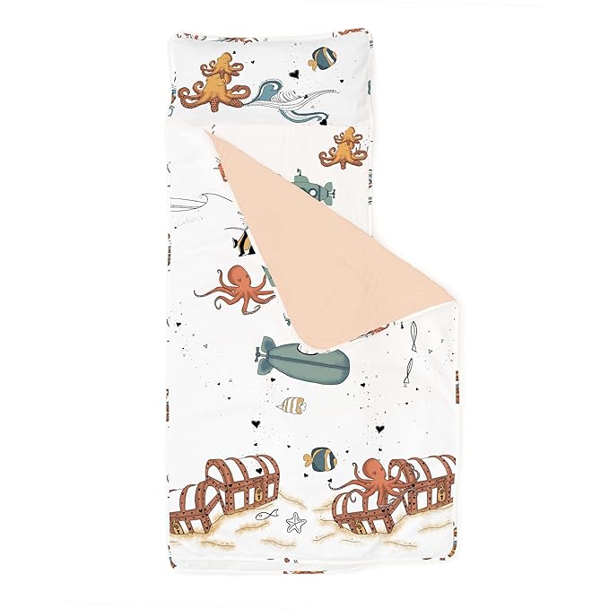 JumpOff Jo - Extra Long Toddler Nap Mat for Preschool, Daycare and Kindergarten - Sleeping Bag for Kids with Removable Pillow and Ultra Soft Blanket - Octopus Treasure