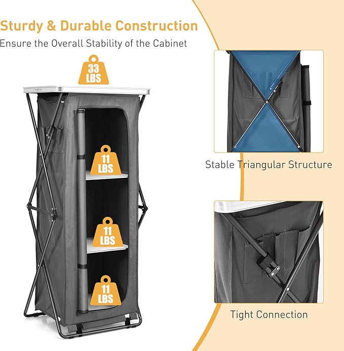 - 🏕️Sturdy & Durable Construction: Crafted with powder-coated steel frame, the pop-up cupboard is durable and sturdy to ensure the overall stability of this cabinet. The load capacity of each shelf is up to 11 lbs while the top can support up to 33 lbs. Besides, the hook and loop fasteners on the bottom can fix the whole cabinet body tightly.