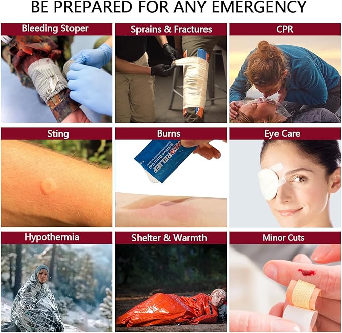 - Comprehensive First Aid Kits: This is a large premium kit. It contains basic supplies for treating minor cuts injuries and burns. Also has Israeli, splints,CPR masks,etc. Helps in emergency during camping, hiking, disasters like hurricanes and earthquakes