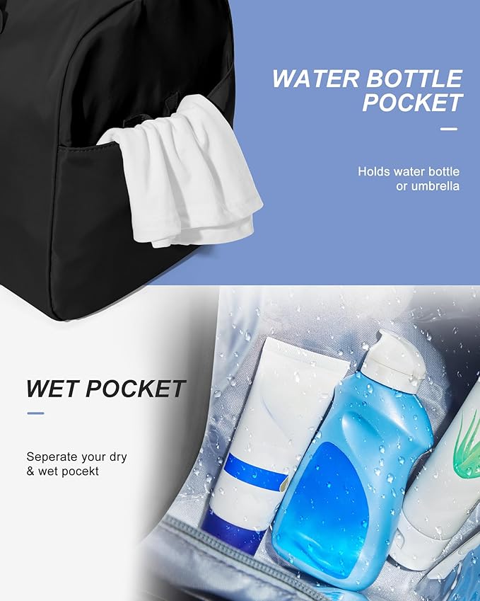 • Dry and Wet Separation: The travel duffle bag is made of waterproof material, the dry and wet separation bag can help you separate dry and wet items, if you have wet clothes or towels, you can put them in the wet bag