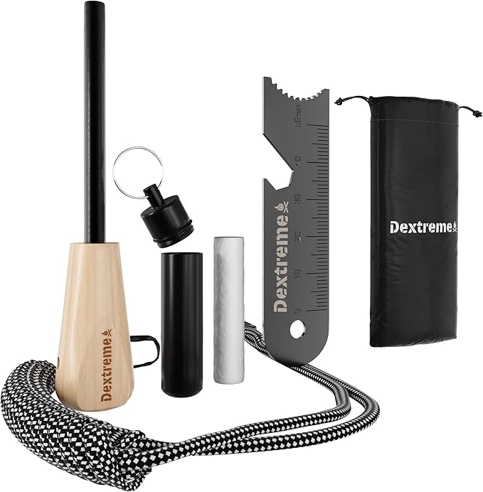Dextreme Ferro Rod Flint Fire Starter Kit with Handcrafted Wood Handle, Coton Tinder, Transport Bag Multi-Tool Striker Paracord Lanyard for Camping Gear 12,000+ Strikes 5/16'' Thick Bushcraft Survival