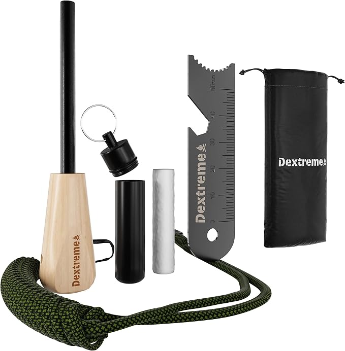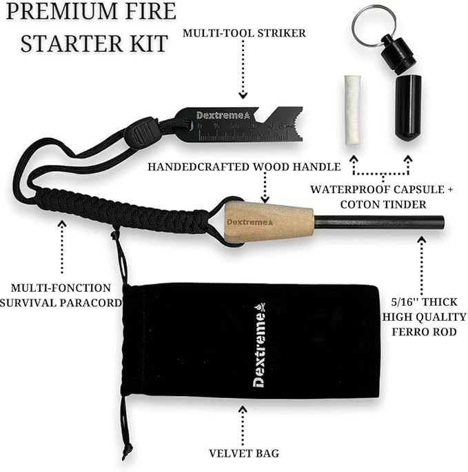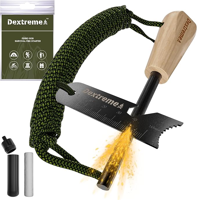 Dextreme Ferro Rod Flint Fire Starter Kit with Handcrafted Wood Handle, Coton Tinder, Transport Bag Multi-Tool Striker Paracord Lanyard for Camping Gear 12,000+ Strikes 5/16'' Thick Bushcraft Survival